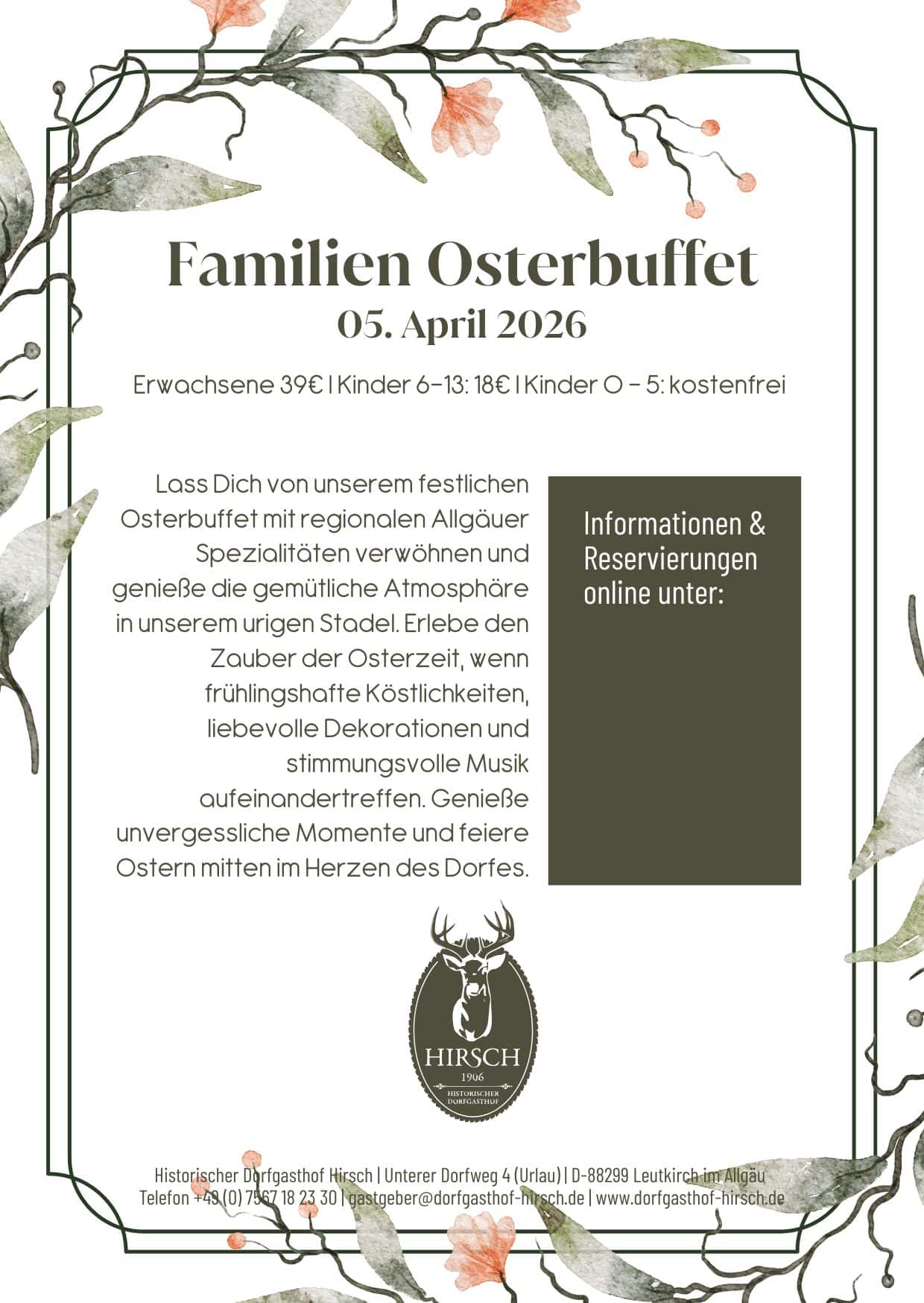 Familien Oster-Buffet Sonntag, 5. April 2026 um 11:30 Uhr Lass Dich von unserem festlichen Osterbuffet mit regionalen Allgäuer Spezialitäten verwöhnen und genieße die gemütliche Atmosphäre in unserem urigen Stadel. Erlebe […]
